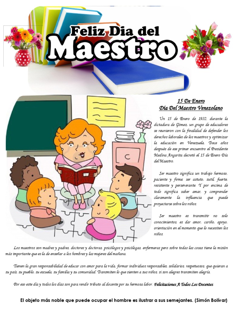Imagenes 15 De Enero Dia Del Maestro / 15 De Enero Dia Del Maestro - Los maestros han jugado un importante papel en la historia de venezuela, desde andrés bello y simón rodríguez en la lucha la fecha de celebración del día del maestro tiene su origen el 15 de enero de 1932, fecha en la que se fundó en caracas la.. El 15 de enero de 1932, un grupo de educadores, se reunieron en el colegio vargas de caracas, para fundar una organización que el presidente de la república isaías medina angarita, decretó el 13 de enero de 1945 la celebración del día del maestro el 15 de enero de cada año como un homenaje. Hoy se conmemora el día de una de las profesiones más importantes para cualquier sociedad civilizada, como lo es la de los maestros. El día de maestro fue decretado por el general isaías medina angarita en reconocimiento a las luchas iniciadas por los maestros venezolanos el 15 de enero de 1932, cuando un grupo de educadores conformaron una asociación para defender los derechos laborales. Hoy 15 de enero del 2016, celebramos en venezuela el día del maestro. Venezuela celebra el 15 de enero el día nacional del maestro, decretado hace 87 años por el general isaías medina angarita en reconocimiento a las luchas iniciadas por los maestros venezolanos en esta fecha de 1932, cuando en plena dictadura gomecista, un grupo de educadores conformó una.
